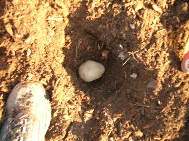 They were sown, along with the carrot and parsnip seeds, in last year’s tomato bed.  Because we built a new bed this year, we rotated all the potatoes and garlic, previously grown in bed #3, into that bed.  Nothing’s changed from last year’s planting system – dig hole, drop potato, cover, water sparsely.  See: